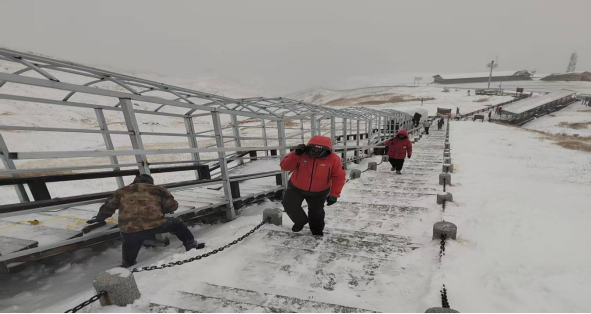 據(jù)了解,公司充分考量冬季長(zhǎng)白山主峰風(fēng)大雪大的極端氣候特點(diǎn),避雪長(zhǎng)廊最終確定采用穩(wěn)固的鋼架結(jié)構(gòu),搭配透明且韌性極強(qiáng)的耐力板,工程總長(zhǎng)900米,寬2米,高約3米。該工程除焊接、切割等專業(yè)性較強(qiáng)的工序外,扛管、釘板等基礎(chǔ)工作均由一線員工完成。如何把近90噸施工材料運(yùn)送到1442級(jí)臺(tái)階沿線是施工最大難題。受地理環(huán)境的限制,最終只能選擇人力運(yùn)送,以每人50級(jí)臺(tái)階進(jìn)行接力,把數(shù)十斤,甚至百斤重的鋼管和耐力板扛送到指定沿線施工點(diǎn),他們每天接力往返近百次。凜冽寒風(fēng)中,員工們肩頭的壓痕、凍紅的雙手,都化作了工程推進(jìn)的堅(jiān)實(shí)印記。