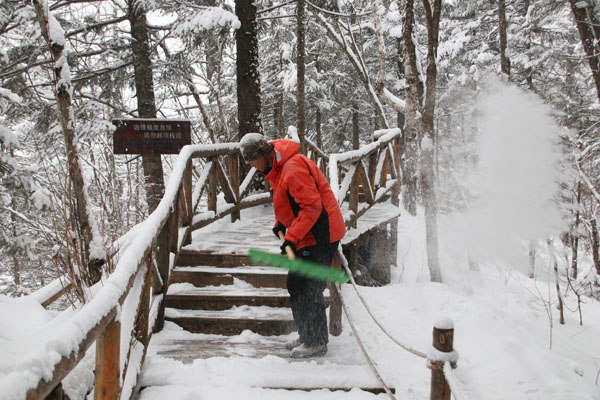 大年初一,長(zhǎng)白山普降瑞雪,公路積雪厚度近50厘米,服務(wù)先鋒黨小組以雪為令,小組中以黨員為骨干的清雪防滑隊(duì),凌晨就頂著星辰和寒風(fēng)開(kāi)始清雪除障作業(yè),保證道路在山門(mén)開(kāi)放前安全暢通達(dá)到開(kāi)放要求,大家克服凜冽的寒風(fēng)完成1800米棧道積雪清理工作。